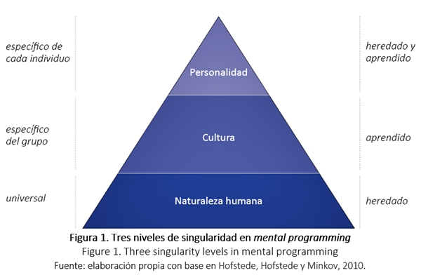 La fuente de dichos programas se encuentra en el entorno social en el que el individuo ha crecido y ha recogido su experiencia de vida. El punto de partida para la «programación» es la familia, continuado por el vecindario, la escuela y el trabajo. Un sinónimo para el mental software es la cultura, la cual representa un fenómeno colectivo porque se comparte con otras personas que viven en el mismo entorno donde se aprendió. La cultura distingue entre miembros de distintos grupos. Así que la cultura deriva del entorno social y no de los genes, se aprende y no se hereda. La cultura se distingue de la naturaleza humana y de la personalidad del individuo. La Figura 1 muestra dicho constructo, lo cual se explica en seguida con detalle.