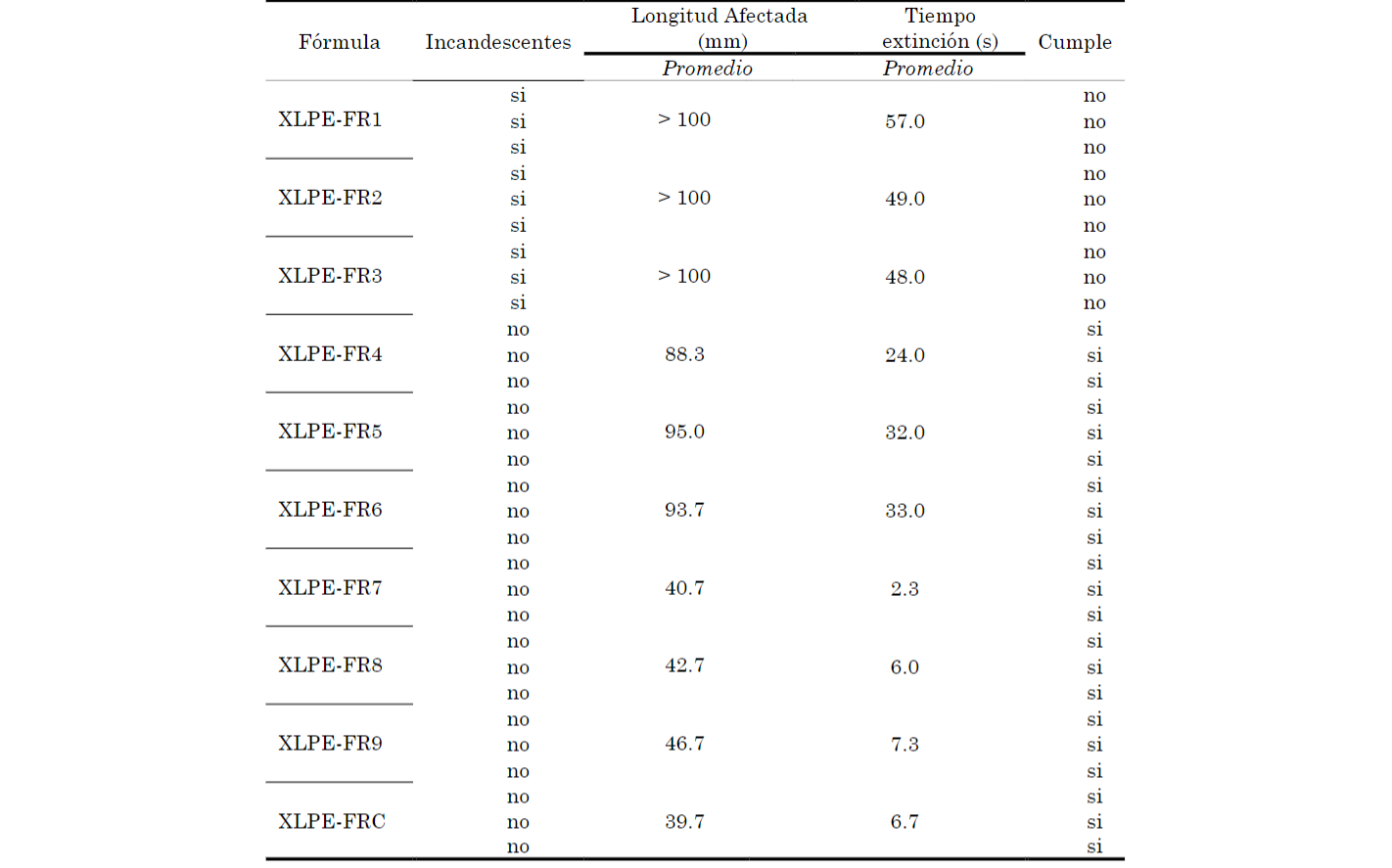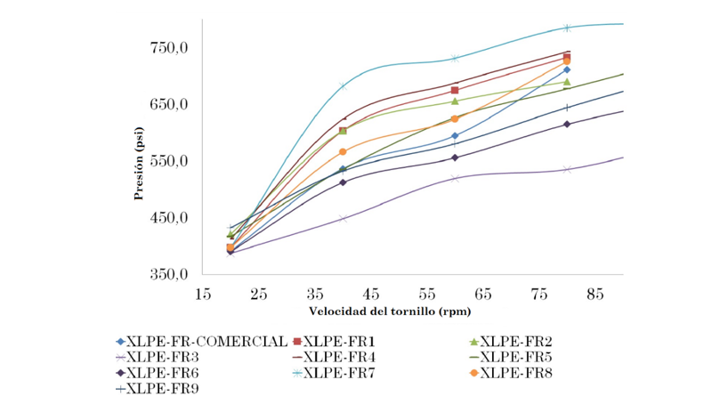 El XLPE-FRC, fabricado con el MBFR comercial, tiene valores de presión, durante la extrusión, que son considerados intermedios con respecto a los nueve aislamientos resultantes del diseño de experimentos. Los XLPE-FR que más se acercan al comportamiento del XLPE-FRC son el XLPE-FR6, XLPE-FR5, XLPE-FR8 y XLPE-FR9. Para un proceso industrial resulta favorable que la presión de extrusión del aislamiento XLPE-FR no sea elevada, para ello se toma como patrón de referencia el XLPE-FRC, lo cual permitió identificar que los aislamientos con mejor comportamiento en un proceso industrial desde el punto de vista de la presión de extrusión, serían los aislamientos con valores de presión próximos e inferiores a los presentados por el XLPE-FRC.