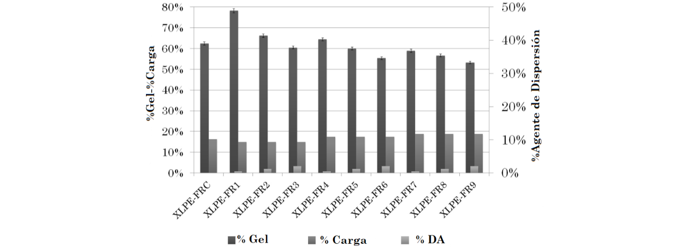 Al observar los aislamientos que son fabricados con los MBFR que presentaban un mismo contenido de agente de dispersión, pero niveles de carga diferentes, se encuentra que entre mayor sea el contenido de carga del MBFR, menor es el contenido de gel del aislamiento. En este sentido, el entrecruzamiento del XLPE-FR, se favorece en los aislamientos que se caracterizan por ser fabricados con bajos niveles de cargas y bajos niveles de agente de dispersión. El aislamiento que presentó un mayor valor en el contenido de gel fue el XLPE-FR1, caracterizado por contar con el menor nivel de carga y agente de dispersión. Por el contrario, el aislamiento con menor valor de contenido de gel fue el aislamiento XLPE-FR9, que presentó el mayor contenido de cargas y de agente de dispersión.