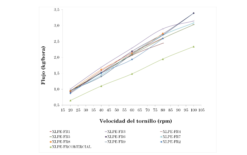 En la Fig. 5 se presenta la correspondencia existente entre el flujo de salida del material en el cabezal de extrusión y la velocidad del tornillo. En ella se observa que el aislamiento XLPE-FRC es el material con menores valores de flujo a la salida del cabezal de extrusión, para las diferentes velocidades evaluadas, cuando fue comparado con el flujo de salida de los nueve XLPE-FR experimentales. Para los aislamientos fabricados con los MBFR caracterizados por contener niveles de agente de dispersión bajo y medio, se puede observar que a medida que se incrementa la proporción de la carga sin modificar el nivel de agente de dispersión, el flujo de la mezcla XLPE-FR a la salida del cabezal tiende a reducirse. Este fenómeno no fue observado para los aislamientos fabricados con MBFR de alto nivel de agente dispersión, encontrándose adicionalmente que en estos a medida que se aumenta el nivel de carga en el MBFR, manteniendo constante el nivel de agente de dispersión, el flujo del XLPE-FR permanece estable. También es de resaltar que para aislamientos fabricados con los MBFR donde se mantiene constante el nivel de carga, al incrementar el contenido de agente de dispersión en el MBFR, el flujo del XLPE-FR a la salida del cabezal se incrementa. Lo anterior se observa para los niveles de carga bajo, medio y alto.