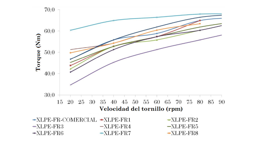 En la Fig. 6 se muestra la correspondencia existente entre el torque de extrusión y la velocidad del tornillo. En ella se observa que para las diferentes velocidades de tornillo evaluadas, los XLPE-FR fabricados con MBFR de bajo nivel de carga, presentan los menores valores de torque durante su extrusión. Además de ello, al aumentar el contenido de agente de dispersión en el MBFR manteniendo constante el contenido de carga, se observa que el valor del torque de extrusión del XLPE-FR se reduce. Este comportamiento se presenta para los XLPE-FR fabricados con medio y alto nivel de cargas. Para aislamientos XLPE-FR fabricados con MBFR del mismo contenido de agente de dispersión, pero con valores de carga variables, se encuentra que a mayor contenido de carga, el torque de extrusión del XLPE-FR aumenta. Adicionalmente, en la Fig. 6 se observa que el XLPE-FR3, es el aislamiento que presenta menores valores de torque durante su extrusión, para las diferentes velocidades de tornillo. El MBFR3 empleado para fabricar el XLPE-FR3, se caracteriza por contener el nivel de carga menor y el nivel de agente de dispersión mayor, reuniendo las dos condiciones requeridas para favorecer que se presente el menor torque de extrusión. El aislamiento XLPE-FR7, fabricado con el MBFR7, es el aislamiento que durante su extrusión requiere de mayor torque para ser procesado, debido a que el MBFR7 contiene el nivel de carga mayor y el nivel de agente de dispersión menor.