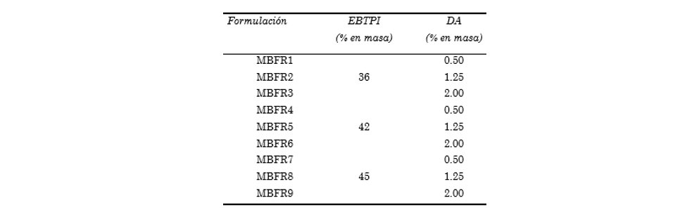 La obtención del MBFR, de acuerdo con las diferentes formulaciones planteadas en la Tabla 1, se llevó a cabo en dos etapas. En la primera se utilizó un mezclador planetario P600 Brabender a una velocidad de 140 rpm y temperatura ambiente. Se mezcló primero el EBTPI junto con el ATO y ZB durante 3 minutos y luego se adicionaron el resto de componentes (LLDPE, DA y Cera PE), mezclando por 3 minutos más. Posteriormente, el MBFR en polvo pasó a la segunda etapa de compounding, donde fue mezclado intensivamente en un Lab-Compounder Brabender constituido por una extrusora de doble tornillo (twin screw extruder). A la salida (cabezal) se obtienen un par de “espaguetis” de material fundido (melt) que se pasan a través de una canaleta de enfriamiento por agua, seguido de un dispositivo granulador (peletizador) para obtener finalmente el producto en forma de gránulos (pellets).