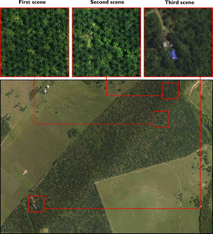 In this section, the proposed framework is compared with two state-of-art unmixing methods: SUnSAL [23] and SUnSAL TV [24]. Fig. 8 illustrates the performance of the proposed computational framework with the third scene. Comparisons with pure pixel estimation methods were conducted, and the obtained results shown the effectiveness of the proposed method to map oil palm plantations. It can be seen that this area is not homogeneous. Namely, it contains objects that are not oil palm trees, i.e., buildings, other trees, and shadows.