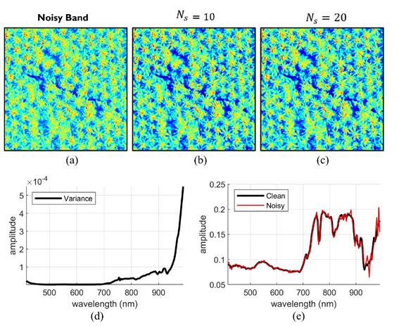 This section explores the effect of selecting the parameter 𝜆𝑇𝑉 and the number of features 𝑁𝑠 on the performance of the proposed method for oil palm identification. In the inference experiments, such as unmixing, classification, and detection, the estimators have been improved when denoising techniques are applied as a preprocessing step. Fig. 3(a) is the original noisy spectral band 160, while Figs. 3(b) and 3(c) show the clean spectral band 160 when the rank of the matrix 𝐗 is 𝑁𝑠=10 and 𝑁𝑠=20, respectively. As can be seen in Fig. 3(d) (diagonal covariance matrix), the high noise is present in the 160 band, which can be observed in Fig. 3(e) that the pixel in the clean dataset is smooth with respect to the original pixel in the noisy dataset. The estimation of the number of endmembers is a critical stage in the unmixing. In this work, we consider two of the most widely used approaches: virtual dimensionality (VD) [25], which allows some flexibility in the estimation by having an additional input parameter that enables the control of the sensitivity of the method, and hyperspectral signal identification with minimum error (HySime) [17], which offers advanced features when modeling the noise present in the HSIs. The average number of endmembers estimated by the HySime algorithm for the three scenes was 9 endmembers. However, based on knowledge of the actual terrain and each scene used in this work, the endmembers with the greatest abundance and interest in this study are shown (diseased oil palm, healthy oil palm, grass, soil, and roof).
