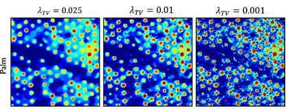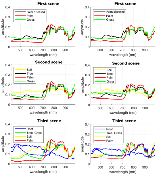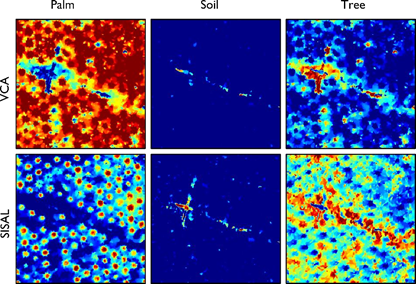 The SISAL regularization parameters were set to 𝜆=10, and the remaining parameters were set to 𝜏=1 and 𝜇 = 10−4. Fig. 4 shows the endmember signatures estimated by using SISAL (first column) and VCA (second column) for each scene. Note that the results of endmembers estimated by VCA in the three scenarios are very similar to those of SISAL. However, when abundances are estimated, the difference between VCA and SISAL is noticeable. Figures 5 and 6 show the abundances using the proposed method for the first and second scene, respectively, when the endmembers matrix is initialized using VCA (first row) and SISAL (second row). In optimal conditions, the algorithm without the pure pixel assumption offers a better performance. In the abundance results in the second row in Fig. 6, the red points indicate the oil palms detected by the proposed method and the blue spaces, other types of objects. Note that the proposed method achieves great oil palm identification results using SISAL, as opposed to when the endmembers are initialized with VCA. Furthermore, Fig. 7 shows the effect of the parameter 𝜆𝑇𝑉 on palm identification; the proposed method is applied to the dataset with three different values of 𝜆𝑇𝑉 =0.025,0.01,0.001 and 𝑁𝑠=10. It can be seen that using 𝜆𝑇𝑉 =0.01 yields better results than other cases.