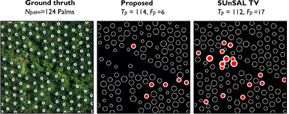where 𝑁𝑝𝑎𝑙𝑚 is the total number of palm trees in the image; 𝑇𝑝, the true positive detection indicating the number of detected palms trees; and 𝐹𝑝, the false negative detection indicating the number of palm trees that were not detected (missed). Fig. 9 shows some palm and no-palm templates highlighted with circles bythe CHT algorithm. In the first image, the white circles represent the true location of oil palms. In the second and third images, the white circles represent 𝑇𝑝, and the red circles represent 𝐹𝑝, which are estimated from abundance map by the proposed method and SUnSAL TV, respectively. For example, the oil palms missing in the detection are marked with red circles. Oil palm trees can be missing from the detection because of the presence of other objects or tree crowns close together. Table 1 illustrates the detection results using different measurements. Note that the results suggest that the proposed method is the most promising strategy as preprocessing step before oil palm mapping.