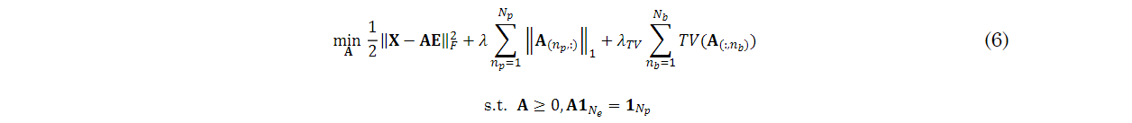 where 𝑇𝑉(𝐀(:,𝑛𝑏)) is a vector extension of the non-isotropic TV and (𝜆, 𝜆𝑇𝑉)≥0 are regularization parameters.
