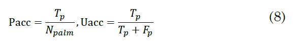 In addition to that, an oil palm detection procedure was applied for evaluation purposes. After the abundance maps of the oil palm plantation were estimated, oil palm detection was performed using the Circle Hough Transform (CHT) algorithm [26], the Producer Accuracy (Pacc) and User Accuracy (Uacc) by (8)