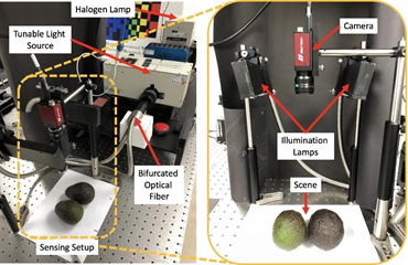 An optical assembly was built in our laboratory to capture spectral images of the avocados. The built setup is shown in Fig. 2. This assembly uses a tunable light source (Oriel Instruments, TLS-300XR) that decomposes the illumination from a halogen light source in its corresponding monochromatic wavelengths, with steps of 6 nm within the spectral range between 300 and 900 nanometers. Such monochromatic light is propagated through a bifurcated optical fiber (Illumination Technologies, 9145HT dual 6" lightline) towards 2 lamps that illuminate the sample scene.