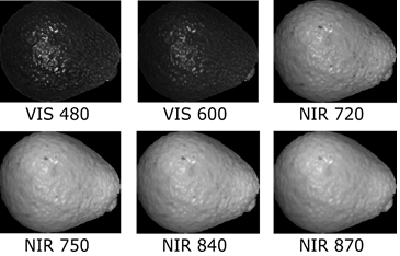 The lens (Navitar, MVL8M23, 8 mm EFL, f/1.4) and camera (Stingray F-080B) pair is focused on the scene in such a way that the monochromatic sensor captures the intensity of the monochromatic light reflected by the avocados. The hyperspectral image of each avocado exhibits 600*900 pixels of spatial resolution and 100 wavelengths. Some examples of spectral bands captured with the proposed assembly are shown in Fig. 3, and the mean spectral responses of the three categories are plotted in Fig. 4.