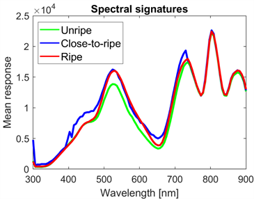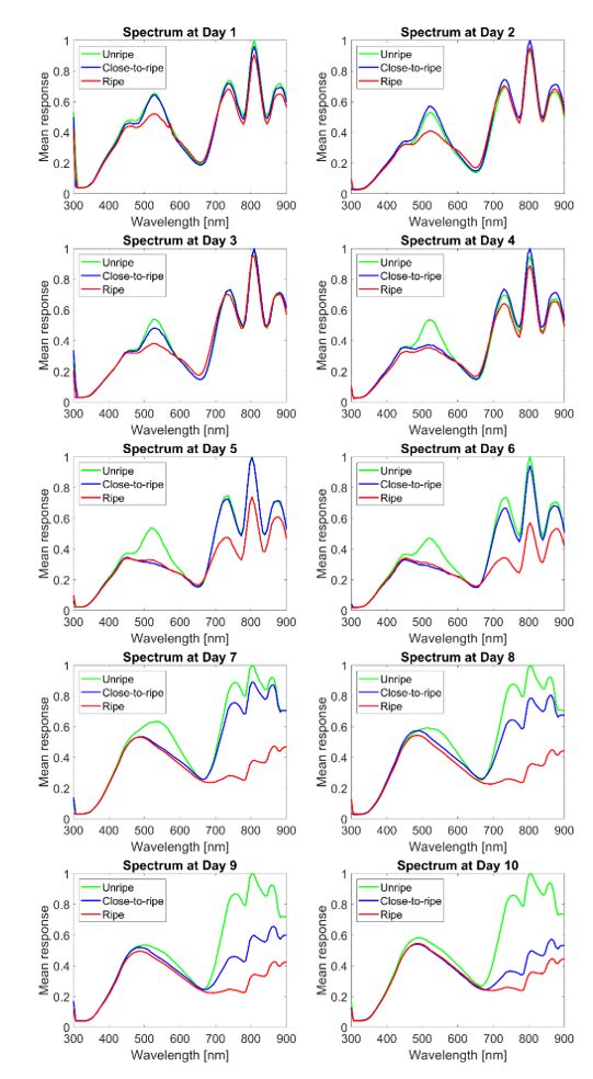 In Fig. 10, it can be noticed that the spectra at day 1 are highly correlated with those in Fig. 4, and the ripe spectrum starts to be noticeable after day 6. Note that, at day 10, a clear separation of the categories is observed in the NIR spectrum.