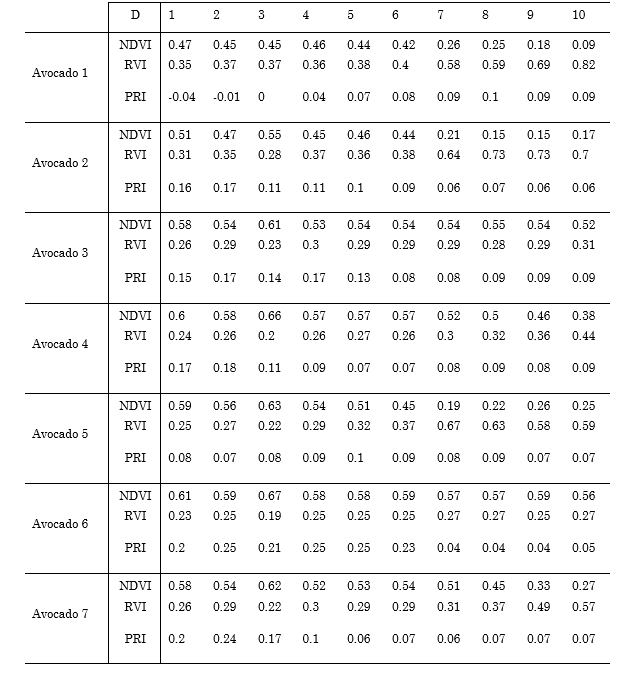 Based on the description of the spectral vegetation indices and their equations in the previous section, we calculated them for each avocado over the 10 days of the study. The obtained results are summarized in Table 2. Each column in the table represents the vegetation indices (NDVI, RVI, and PRI) of an individual avocado, and each row represents the day of the ripening process. By analyzing the NDVI vegetation index, it is observed that, as time passes, the NDVI reflectance value decreases, which is a sign of the ripening process, since the color skin of the avocado changes from bright green to close-to-brown dark green.