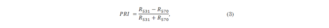 Besides infrared radiation to detect plant changes, the visible part of the spectrum has also been useful for early stress detection. This involves using indices focused on bands at specific wavelengths, where photosynthetic pigments are affected by water stress conditions such as chlorophyll. An example of this sort of indices is the Photochemical Reflectance Index (PRI) [22], which is given by: