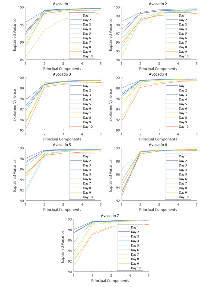 When employing PCA, first, it is critical to know the variability of the data under study. A common way to calculate this is through the explained variance plot, which shows how much variance of a data set is explained by the principal components. Fig. 6 shows the variance explained by the principal components for each avocado during the 10 days. From this figure, it can be noted that the first two principal components explain more than 95% of the avocado’s variance, regardless of the day of ripening.