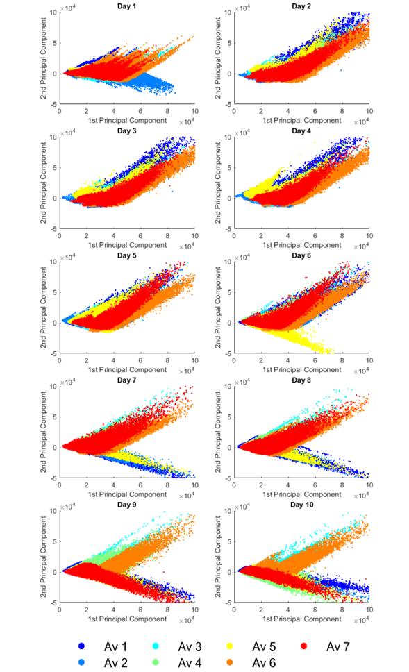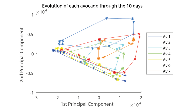 On days 7 and 8, the first (blue), second (light blue), and fifth (yellow) avocados exhibited a distribution of points with a decreasing behavior. On day 9, the behavior of avocados one, two, and five did not change and, additionally, the seventh avocado (red) exhibited the same decreasing trend. Finally, on day 10, the avocados mentioned above followed the same trend, but now the fourth avocado (green) joined that decreasing tendency. Note that, out of the 7 avocados, the third (cyan) and sixth (orange) maintained their increasing behavior until day 10. Considering those trends, it can be concluded that the decreasing behavior in the second principal component is indicative of the ripening level of avocados and, therefore, avocados 1, 2, and 5 correspond to the ripen category, since they are the first to exhibit the decreasing behavior. They are followed by avocados 7 and 4, which fall into the close-to-ripe category. Finally, avocados 3 and 6 can be classified as unripe