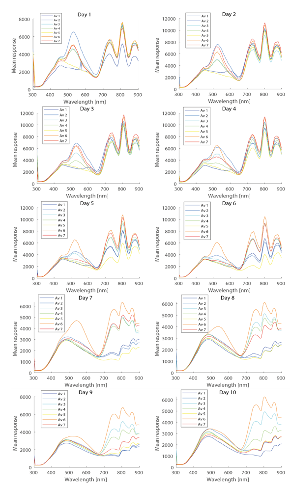 On days 3 and 4, the spectral responses of the fourth and seventh avocados decrease in the visible region, while they remain unchanged in the region of the NIR. From day 5 to day 10, the spectral response of most avocados, except for the sixth one, is observed to constantly decrease in the visible spectral region. In contrast, the NIR region varies drastically since day 5 since different changes in the spectral response take place.