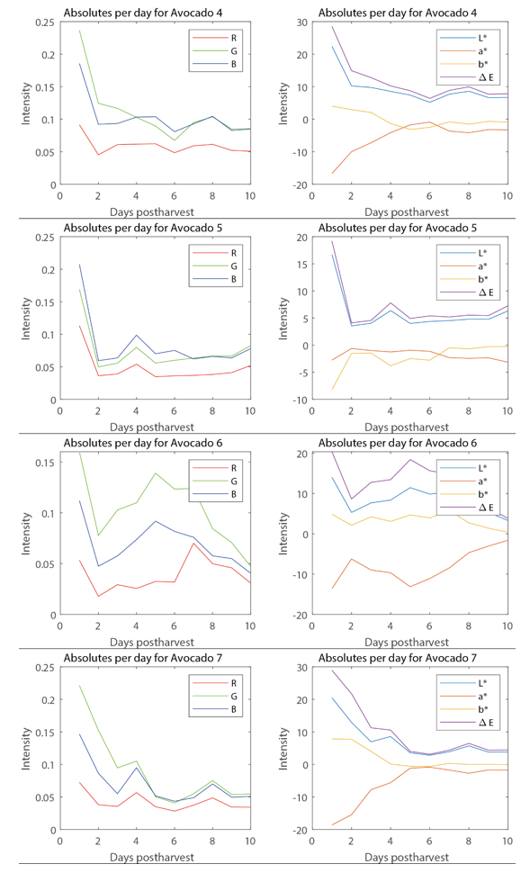 In a colorimetry analysis, the avocado skin color was tracked in the RGB coordinate domain as well as in the CIE L*a*b* color space. The latter is used since it expresses color as three numerical values, L* for the lightness, a* for the green–red and b* for the blue–yellow color components. This color space was designed to be perceptually uniform with respect to human color vision [24] [25]. The color differences in the RGB domain were measured by simple subtraction of color indices between each day and the indices since the first day; and the L*a*b* differences were measured through the ∆E index, given by: