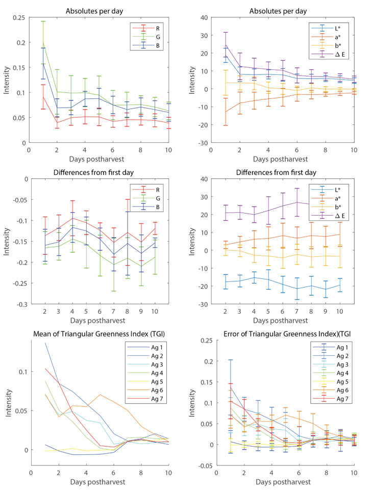 The second row of Fig. 12 shows the averaged values of the specific errors with respect to the first day (differences from first day). In RGB (on the left), a variant deviation of the three channels is observed, with day 6 exhibiting the greatest variation. Such day is considered critical for the avocado population under study because most of them undergo an advanced state of ripening by then. With respect to the CIE color space (on the right), ∆E and a* present an increasing behavior, whereas the intensity values of L* and b* decrease over time.