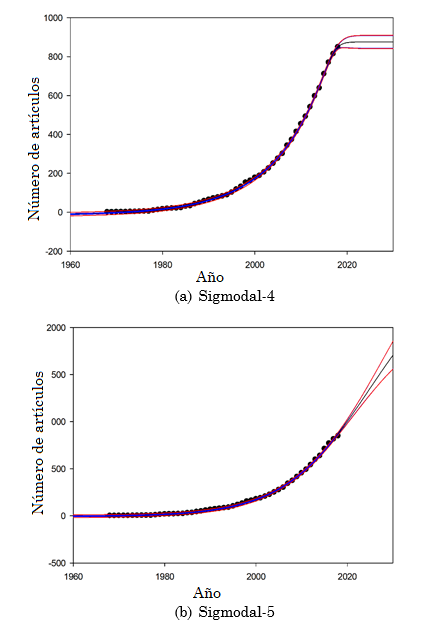 Los datos de la columna de acumulación de artículos fue ingresada al software Sigmaplot, utilizando los modelos descritos por el programa: sigmoideas 3-4-5 parámetros, logísticos 3-4 parámetros, Weibull 4-5 parámetros, Gompertz 3-4 parámetros, Hill 3-4 parámetros y Chapman 4-5 parámetros, siguiendo la metodología propuesta por [