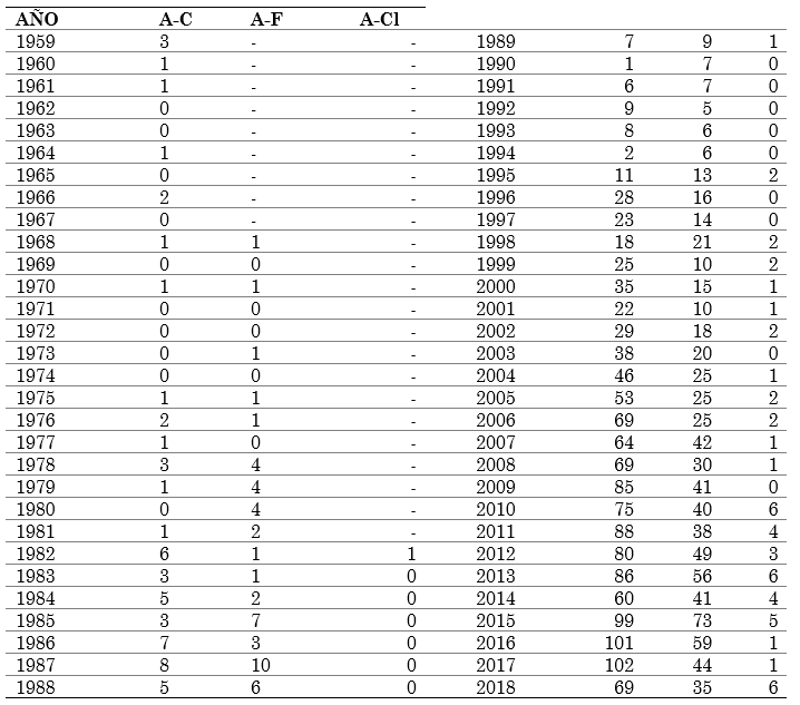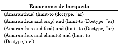 Mediante el uso de ecuaciones de búsqueda, se organizaron los artículos presentes en la base de datos Scopus en temas de la producción primaria de amaranto y su relación con investigaciones en torno al cultivo, la elaboración de alimentos y la interacción con el clima (Tabla 1), de manera que se pudieran organizar los datos obtenidos por año y su acumulado durante el ciclo de investigación de cada una de las ecuaciones (Tabla 2).