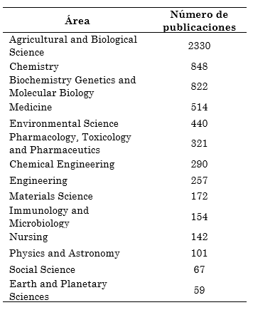 Además, los artículos evaluados a través de las áreas estratégicas de mayor número de publicaciones se encuentran en ciencias biológicas y de la agricultura, ciencias químicas, biología molecular y genética, así como la medicina, el desarrollo rural y social (Tabla 4).