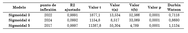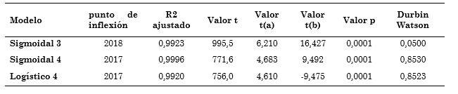 Según los datos obtenidos (Tabla 7), los modelos sigmoidales 3-4 y logístico 4, presentaron los mejores ajustes para la regresión de curva en S, con proyección de R2 mayor a 99 % y p menor a 0,0001; así como puntos de inflexión entre el año 2017 y 2018, no obstante, dos modelos presentaron el mejor valor para el parámetro de independencia (0,853) (Fig. 4).