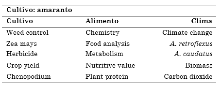 En la Tabla 8, las palabras clave de mayor relación e interés en los artículos publicados para la relación cultivo de amaranto, según la base de datos Scopus, son control de arvenses, maíz (Zea mays) y herbicidas; esto resalta los avances que han realizado instituciones y universidades principalmente norteamericanas, en relación con el control de especies de la familia Amaranthaceae, ya que desarrollan gran adaptabilidad a diferentes condiciones y ponen en riesgo la producción de algunos cereales [