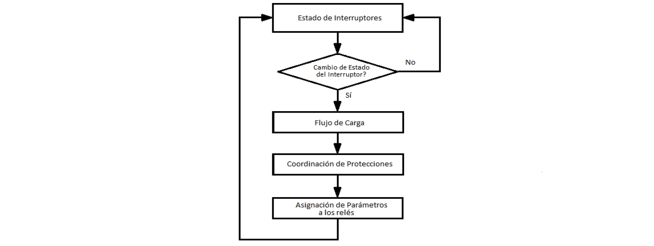 Lo anterior debido a que, si este está en su operación normal, el interruptor permanece cerrado permitiendo el flujo de corriente; pero si el elemento es aislado, el interruptor se abre, e inicia automáticamente el cálculo de parámetros de cada relé para la nueva topología. Este procedimiento se muestra mediante un diagrama de flujo en la Fig. 3.
