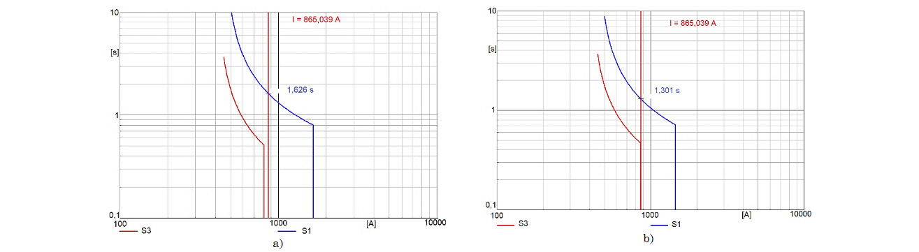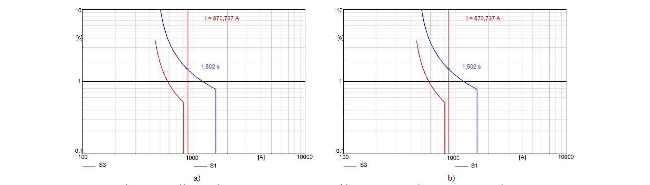 En la Fig. 8 se muestra la misma comparación del cambio de topología al encontrarse deshabilitada la línea 45, pero esta vez se presenta la falla trifásica al 50% de la línea 94. La Fig. 8a muestra los relés S1 y S3 con la coordinación inicial, la cual fue llevada a cabo con el sistema completo sin cambio de topología, y su comportamiento ante la falla y la ausencia de la línea 45.