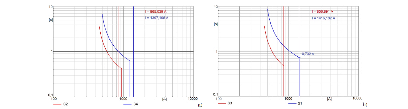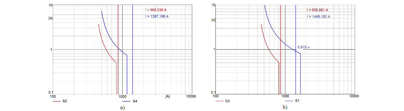 Si las corrientes de arranque manejan una proporción con la corriente de operación, dependiendo de la topología, se pueden presentar valores muy bajos, y causar cruce de curvas de protecciones. Un ejemplo de esto es S2 y S4 cuando el generador 3 está fuera de servicio, y las corrientes de arranque de los relés se configuran como la corriente de operación de la línea multiplicada por un factor de 1.5, como se aprecia en la Fig. 5.