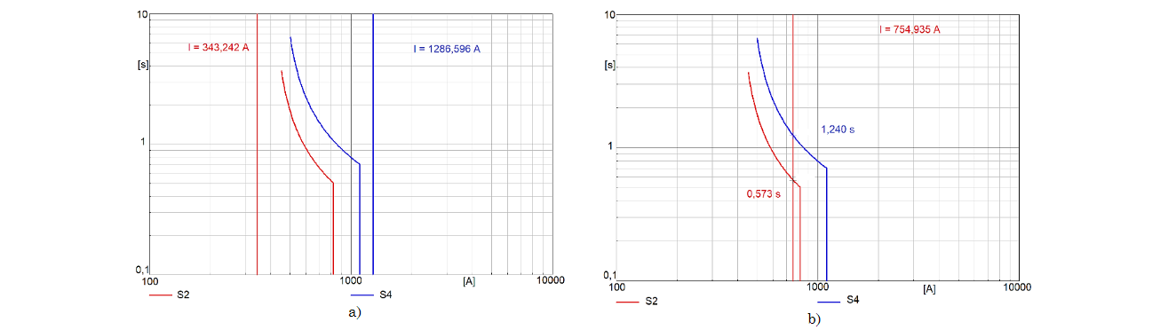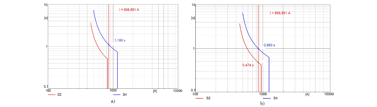 Las curvas inversas de los relés S2 y S4 de la Fig. 9, expresan el comportamiento de estos dos relés ante la presencia de una falla trifásica en el 50% de la línea 94. En la Fig. 9a se aprecian las curvas de los relés con los parámetros calculados en la coordinación inicial con todos los elementos del sistema de potencia en operación normal.