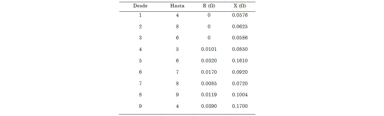 El algoritmo de coordinación se emplea en el caso de estudio de nueve barras IEEE 9 (ver Fig. 1), el cual típicamente se utiliza para el análisis de sistemas de potencia. Este sistema cuenta con 3 generadores sincrónicos, 3 transformadores trifásicos y 6 líneas de transmisión de 230kV. Los parámetros de las líneas del sistema de potencia se presentan en la Tabla 1.