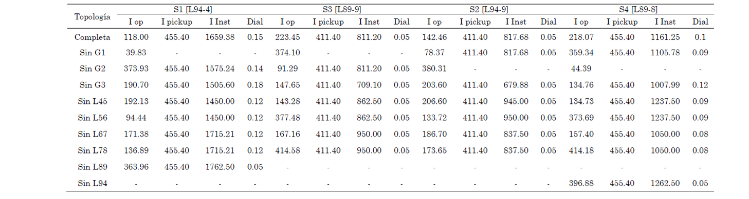 Existen 4 topologías del sistema en los que ciertos relés no obtuvieron parámetros al variar la topología, pero son casos en los que las corrientes de operación y de cortocircuito impiden su cálculo, es decir, el nivel de corto del sistema ante estas topologías no permite una adecuada coordinación. En estos casos los relés de las líneas adyacentes sirven como un respaldo para aislar las líneas de la falla, mostrando que el sistema sigue estando protegido aún en ausencia de relés operativos.