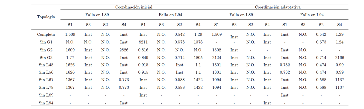 Como se mencionó anteriormente, el nivel de corto del sistema de potencia aumentó, y se ve reflejado en el incremento de las corrientes instantáneas de ambos relés. S2 ya no opera de manera instantánea, tardando en esta ocasión 0.474 segundos, y el tiempo de actuación de S4 disminuyó quedando en 0.990 segundos.Los resultados de la coordinación adaptativa del sistema de potencia comparados con los resultados obtenidos con el cambio de topologías y la coordinación inicial se detallan en la Tabla 3, donde se puede apreciar una disminución de los tiempos de actuación en la mayoría de los casos cuando se implementa el algoritmo adaptativo de coordinación.