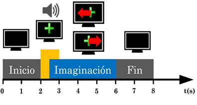 Por cada sujeto se realizaron 20 sesiones y durante cada sesión se ejecutaron 10 ensayos. Cada ensayo tuvo una duración de 8 segundos y solo se desplegó una de las flechas a la vez. El esquema de eventos durante cada ensayo se puede observar en la Fig. 2. Las épocas de las señales EEG para la imaginación de mano cerrada o abierta se extrajeron desde los 2 s hasta los 6 s. En cada sesión se siguió un protocolo de asepsia que consistió en limpiar el cuero cabelludo de los sujetos de experimentación con agua destilada y se aseguró que los canales del Emotiv EPOC presentaran alta calidad de contacto con ayuda del Software Emotiv Test Bench v.15.0.3. Las épocas de las señales EEG extraídas se procesaron mediante un filtro Butterworth de 5º orden pasa banda con frecuencias de corte de 8 – 30 Hz, con el fin de filtrar de forma plana las componentes sensomotoras asociadas a la imaginación de mano cerrada y abierta [