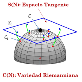 Las expresiones matemáticas para el logaritmo y exponencial Riemanniano para proyección y reproyección tangente, respectivamente, se muestran en (20) y (21). Igualmente, estas operaciones se ilustran en la Fig. 3.
