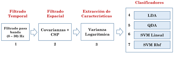 Los vectores de varianza logarítmica de la sección 2.1 y las vectorizaciones de las proyecciones en el espacio tangente de un punto sobre la variedad de Riemann de la sección 2.2 se asocian a cada una de las señales EEG con su respectiva clase. Para estos patrones es posible desarrollar técnicas de clasificación basadas en análisis discriminante cuadrático (QDA) o lineal (LDA) [