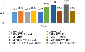 En primer lugar, se observa que independiente del sujeto, los resultados de las miBCI basadas en geometría de Riemann presentaron en promedio un 31 % de desempeño mayor que las basadas en CSP. Sobresalen por su desempeño las siguientes miBCI: RM+GF+MDM, RM+TS+SVM lineal y la RM+GF+TS+SVM lineal. La superioridad en desempeño de las arquitecturas basadas en Riemann respecto a las basadas en CSP se debe a: i) la estimación de las matrices de covarianza promedio por clase en el caso de CSP no es óptima [