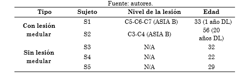 En este estudio se adquirieron segmentos (épocas) de señales EEG asociadas a imaginación de mano cerrada e imaginación de mano abierta de cinco sujetos con edades entre 22 y 56 años, dos de ellos con lesión cervical (S1 y S2) y tres sin ningún tipo de lesión (S3, S4, y S5) (Ver Tabla 1.). De acuerdo con los especialistas médicos, ninguno de los sujetos de prueba presentó limitaciones cognitivas ni daño cerebral que impidiera la participación de los sujetos de experimentación. Asimismo, los sujetos dieron consentimiento informado respecto a las pruebas realizadas y los datos adquiridos.