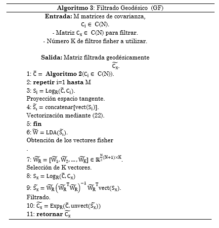 No hay una forma explícita para resolver el problema anterior, pero existen formas iterativas para estimarlo, utilizando el concepto de espacio tangente. Con ayuda del logaritmo Riemanniano entre dos matrices, LogR (C, Ci), se proyecta el conjunto de datos completo, Ci (i=1…M), matrices de covarianza, en el espacio tangente de C. En este espacio, por cierto, de propiedades euclidianas, el promedio puede obtenerse mediante media aritmética. Finalmente, se reproyecta este promedio obtenido al espacio SPD mediante la exponencial Riemanniana entre dos matrices, ExpR (C, Ci). Después de algunas iteraciones, se obtiene la media geométrica de las matrices SPD. Las iteraciones se detienen cuando se ha realizado un número determinado de iteraciones o cuando la distancia de Frobenius de la proyección tangente promedio se hace estacionaria. Ver Algoritmo 2 (ver Tabla 4.)