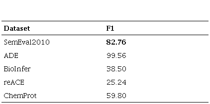 After training and testing, our DL model should have learned how to extract semantic relationships due to the automatic learning of similar in-domain and out-of-domain features. However, our results confirm the need for a balanced dataset and additional information about the in-domain task. The proportion of positive and negative relations and the number of annotated data in the samples are different in each dataset (ADE, BioInfer, reACE, Chemprot, and SemEval).