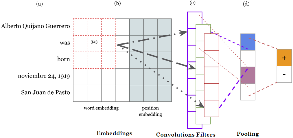 Since we aim to compare the modifications and addition of representations to the baseline model in the biomedical domain, we used different kernel sizes and softmax function modifications; afterward, we included multi representations that captured different characteristics from the input. All of them were gradually changed. Then, for each wi in S, the distributional and not distributional representation was obtained and concatenated in a vector. As result, a matrix representing S was processed by the model in order to perform the classification.