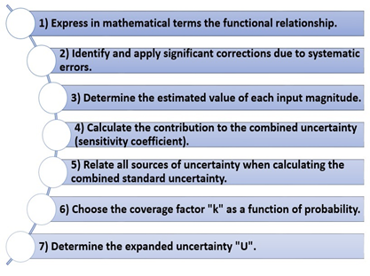 The first step is to express, in mathematical terms, the dependence of the magnitude of output with respect to the input. Then, significant corrections due to systematic errors are identified and applied. The estimated value of each input variable is determined with statistical analysis, calculating, for each input variable, the contribution to the combined uncertainty and observing whether there is a correlation between the random variables. Next, a coverage factor `k` is selected as a function of the probability to determine the expanded uncertainty U. Finally, the result of the measurement is expressed, indicating the estimated output, the associated expanded uncertainty, the coverage factor, and the type of assumed distribution.