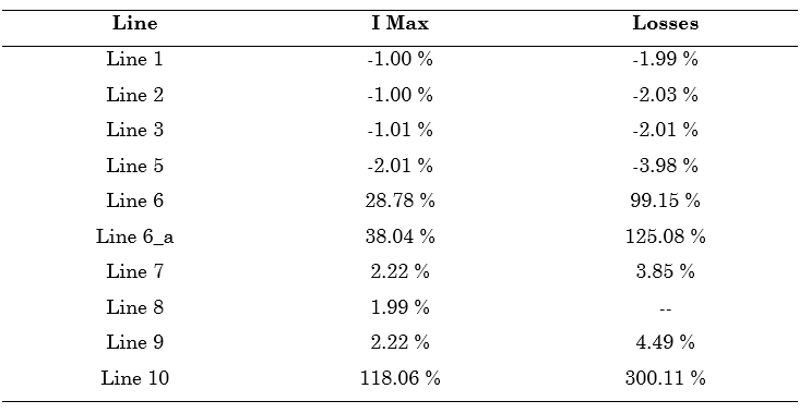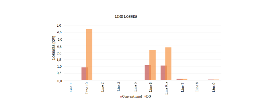 In the Distributed Generation scenario, some line losses decreased up to 107.86 %, but others escalated. In Line 6, losses increased by 99.15 %; in Line 6a, 125.08 %; and in Line 10, 300.11 %. Line 6a is the same Line 6 divided by the distributed load.