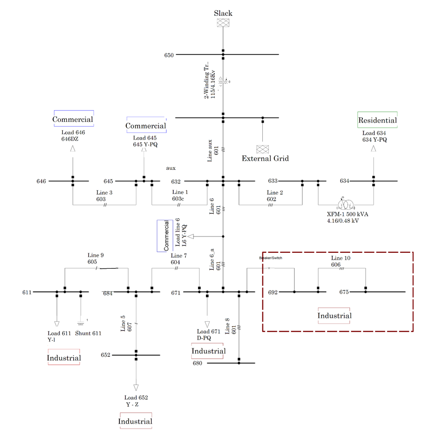 In this study case, to avoid problems in the LDS, the switch that separates nodes 692 and 675 from the system should be activated. By doing this, the self-sufficient industry operates in islanded mode, the existing infrastructure of the network is not affected, and the system’s demand for electrical power decreases. If distribution network operators want to use the DG as a new generator in the LDS, they should implement new lines in the network in order to not to affect the normal operation of the system.