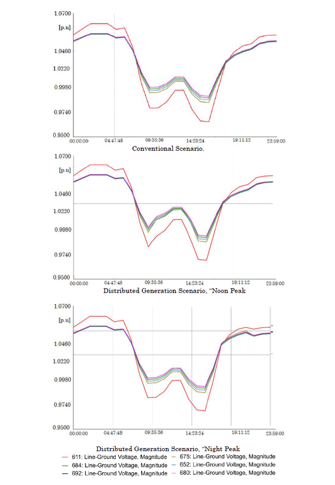 The voltage variations are illustrated in Fig. 4. In Zone 2, there is just a small increase in the voltage level of node 611 (red line) in the two DG scenarios, depending on the operation of the new DGs in the systems. In the other nodes, the system does not exhibit important voltage level changes, only a small increase at different hours, depending on the operation times of the DGs.