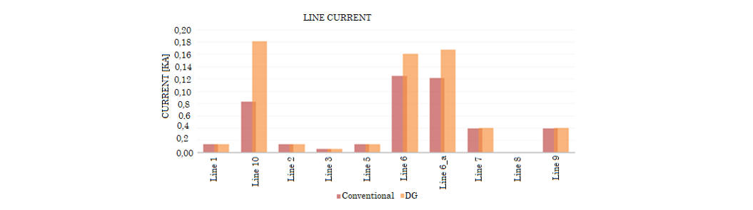 Fig. 8 compares the line losses in the conventional and DG scenarios; and Fig. 9 the line currents in the same scenarios. Table 5. lists the changes in electrical line losses in both scenarios. In this case, the line losses decreased. Due to the implementation of the new generators, the current flow of Line 10 increased from 83 to 181 amperes, which directly affects the losses in that line.