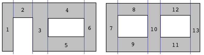 La descomposición rectangular orientada verticalmente debe tener esto en cuenta y definir los rectángulos respectivos como rectángulos sin contracara. Así, todas las formas obtenidas siguen siendo rectángulos simples y se pueden manejar de la misma forma. Es así como la descomposición rectangular final queda como se presenta en la Fig. 5.