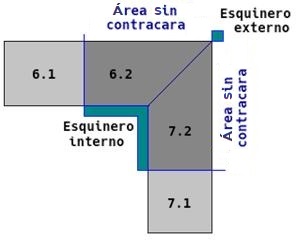 Los rectángulos 6 y 7 hacen parte de una intersección de muros en L. Al colocar un esquinero en el encofrado, cada uno podría divididirse en dos rectángulos más (denominados respectivamente 6.1, 6.2, 7.1 y 7.2) y al menos un par de ellos no tener contracara, porque el esquinero interno cubre parte del área de cada muro (Fig. 4).