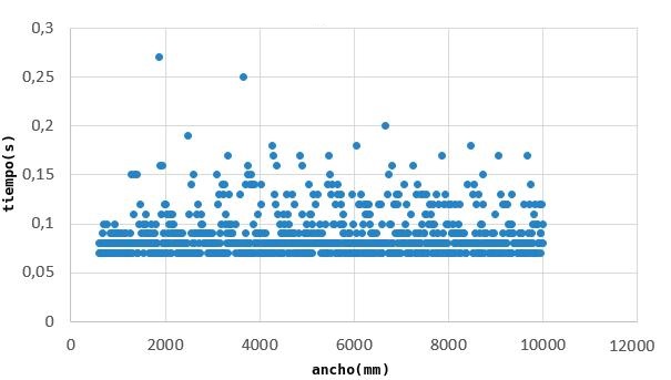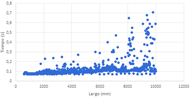 Los tiempos de modulación a lo largo para entradas de 60 cm hasta 10 m en incrementos de 1 cm usando Cbc se pueden ver en Fig. 7. En el gráfico se puede observar que los tiempos tienden a aumentar conforme el largo de la modulación es mayor. Asimismo, se observa, al igual que en los siguientes gráficos, que el tiempo de ejecución no depende únicamente del tamaño de entrada del rectángulo. Hay cierta incertidumbre respecto al tiempo de ejecución que es propia de la exploración que realizan los algoritmos de búsqueda y propagación en CP. Por otro lado, los tiempos de modulación a lo ancho para entradas de 60 cm hasta 10 m en incrementos de 1 cm con Cbc se pueden ver en Fig. 8 y Fig. 9.